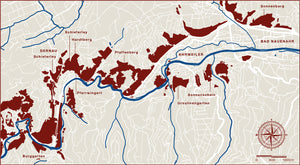 Hier kannst du genau sehen, woher unsere Trauben kommen. Jede unserer Lagen ist mit Namen eingezeichnet. Weiter unten kannst du dir dann noch ein Bild machen.